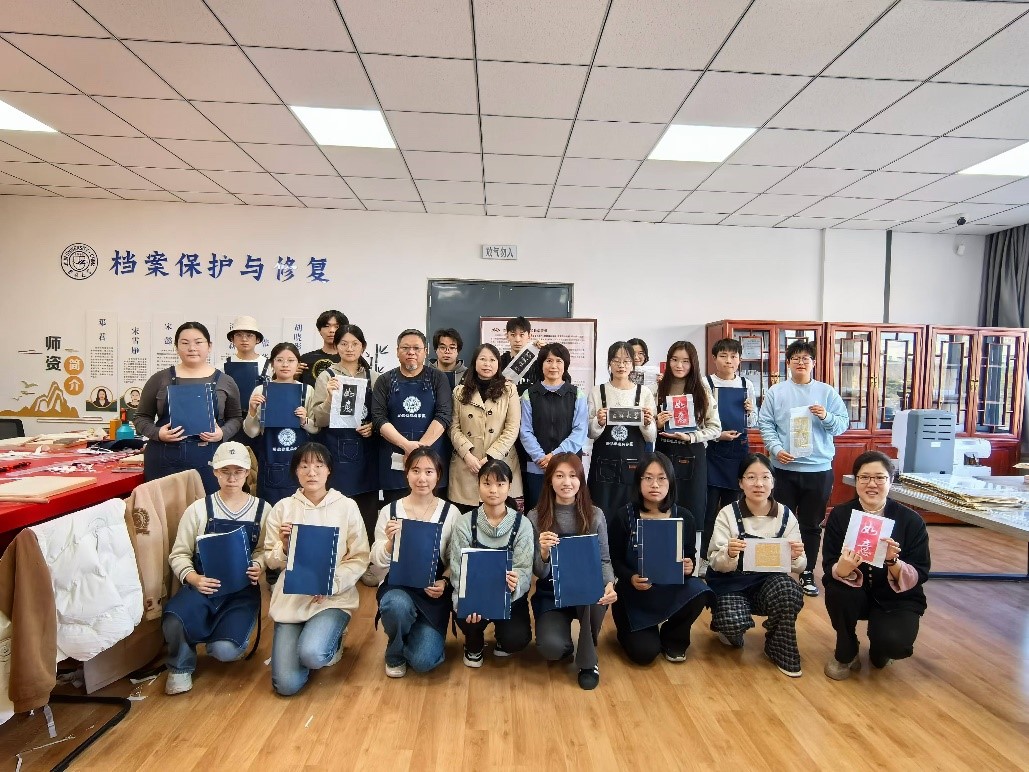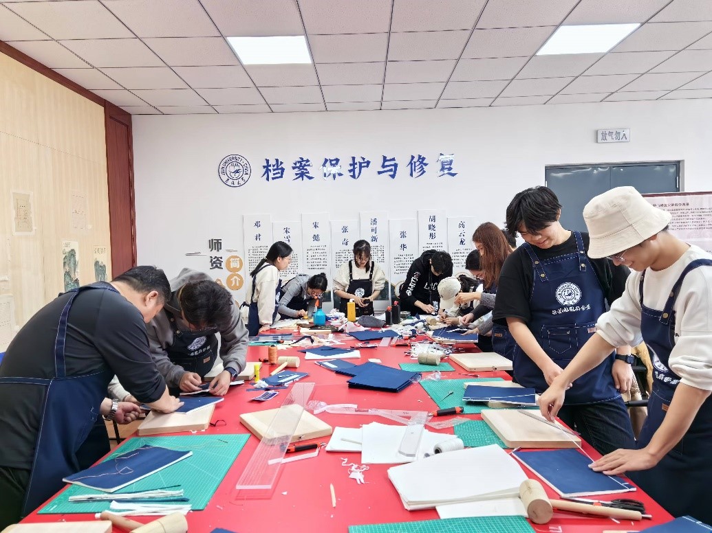 信息管理系主任邓君教授、王阮副教授以及宋懿老师予以指导。本次活动共有20名学生参加。张奇老师亲自示范拓片制作与古籍装订步骤。拓片制作演示时,现场伴随着短促有力的捶打声,石雕图案缓缓浮现在坚韧的树皮纸上,仿佛历史的印记被一点点唤醒。线装书装订从 “绵软无力”的白宣纸对齐,到裁纸时用好巧劲,再到穿线时牢记繁琐的走向,无一不体现了精雕细刻之匠心。学生以饱满的热情积极参与到操作实践中,不仅学到了古籍装订以及拓印技艺,同时更体悟到了中华优秀传统文化传承的责任使命。