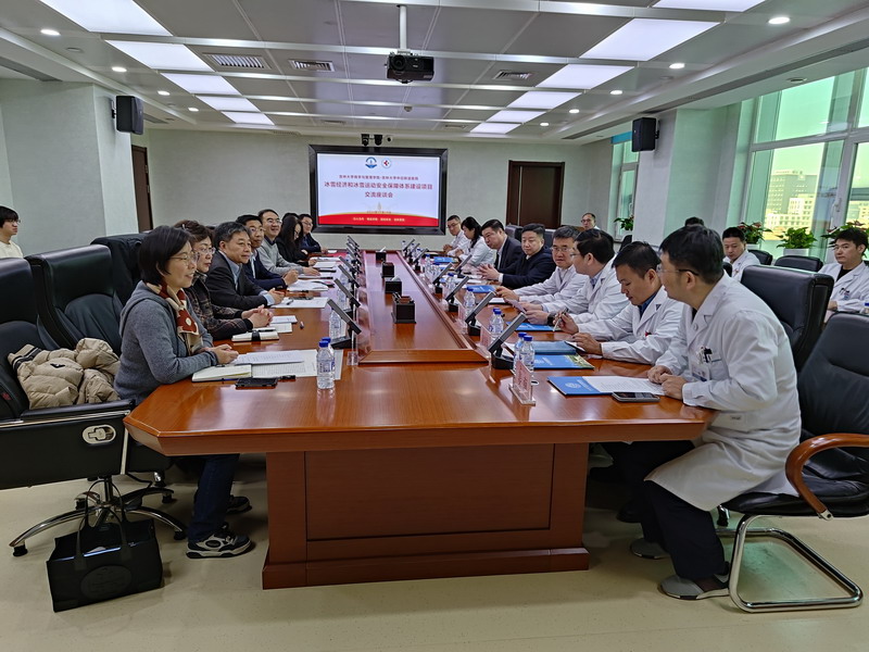 常务副院长隋建利、副院长兼文化和旅游部重点实验室冰雪旅游场地装备和智能服务技术实验室主任辛本䘵、副院长樊雪梅、行政副院长刘欣,实验室副主任刘汉,电子科学与工程学院张彤、赵红然,机械与航空航天工程学院姚永明,数学学院高丽媛等冰雪实验室老师随行参加。吉林大学中日联谊医院党委书记杜建时、副院长顾锐、党政综合办公室主任王宗强、医务部主任崔永亮、护理部主任裴艳玲、科研部主任时景伟、南湖院区院长许卓、骨科创伤骨科病区主任刘光耀、创伤综合病区主任姜南等出席本次座谈会。
