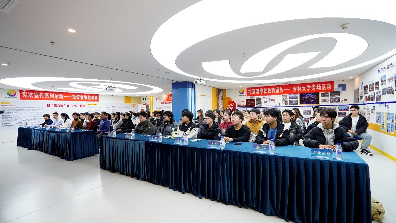2022级信用管理专业全体本科生,在应用金融系主任顾宁教授、副主任张小宇教授带领下,赴东北证券投资者教育基地开展认知实习。本次活动由吉林证监局和东北证券联合组织,并邀请到了吉林证监局法规处宿晓处长、吉林省证券业协会肖刚副秘书长以及东北证券投资者教育基地负责人刘怡姝参与指导。活动旨在让学生深入了解证券市场发展历程与运作模式,同时通过宪法宣传系列活动增强法律意识和投资者权益保护意识。