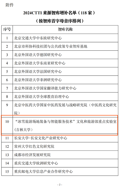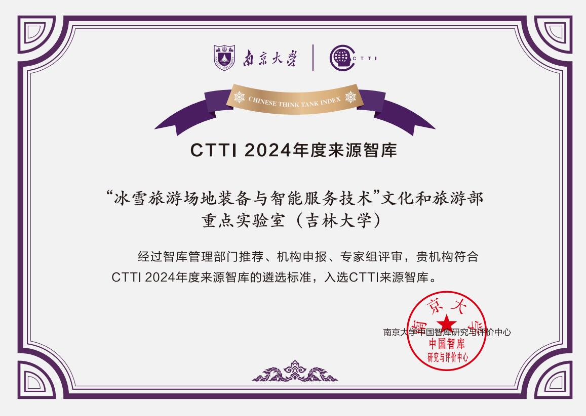 本届论坛公布中国智库索引(Chinese Think Tank Index,简称CTTI)2024年度增补来源智库名单,经南京大学中国智库研究与评价中心组织专家从智库的基础建设、课题与项目、决策咨询、理论创新和舆论引导、内部治理、个性特色等方面认真审核和筛选,“冰雪旅游场地装备与智能服务技术”文化和旅游部重点实验室(吉林大学)从264家申报智库中脱颖而出,成功入选CTTI来源智库。入选理由如下:我院冰雪旅游实验室深入践行“冰天雪地也是金山银山”理念,所研究的“中国冰雪系列指数”成果在海内外产生了广泛的影响,发出了中国声音,并在冰雪经济研究领域构建了具有自主知识产权体系。此次成功入选CTTI来源智库标志着依托我院建设的文旅部冰雪旅游重点实验室迈入了一个更高的发展平台和崭新的发展阶段,在全国冰雪经济和技术研究领域成功塑造了具有显著影响力的“吉大声音”“吉大风格”和“吉大品牌”。