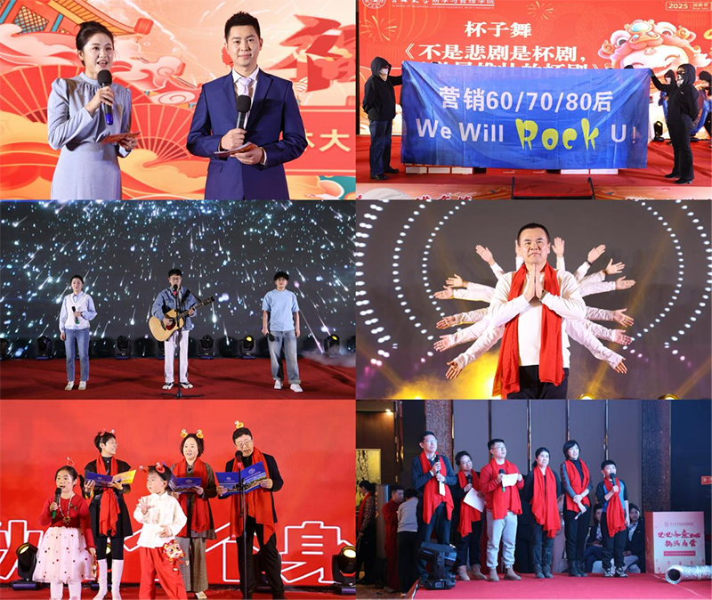 物流与供应链管理系全体教师用歌舞《喜乐年华》以欢快的节奏和喜庆的氛围,拉开了联欢会的序幕,展现了商管人迎接新春的喜悦与对美好未来的期盼。紧接着,组织与战略管理系的全体教师通过经典《校园歌曲串烧》,带领全场回顾了美好的校园时光,重温那些经典的旋律,感受着那份纯真的情感。市场营销系老师们带来的杯子舞《不是悲剧是杯剧,一场激昂雄壮的杯剧》则以独特的创意和激昂的节奏,演绎了一场别开生面的视听盛宴。信息管理系全体教师唱响《夜空中最亮的星》,从《明天你好》展望《明天会更好》,用歌声串联起对未来的美好祝愿,生动展现了全体商管人在过去一年中的守望相助,奋楫笃行,以及对未来的豪情满怀、美好展望。技术经济系全体教师的大合唱《敬业工作联盟》以激昂的歌声展现了商管人的敬业精神与责任担当。白山黑水,先生向北,迎难而上,踔厉奋发,我们将跟随党的步伐,扎根东北,无私奉献,学史鉴今守初心,阔步启航新征程。应用金融系全体教师的朗诵《我爱教学》诉说了商管老师们对教育事业的热爱与执着,金句频出,惊艳全场。国际商务系教师们以情景歌舞的形式,带来《上春山》,以生动的表演和优美的舞姿,描绘了春天的生机与希望,表达了老师们对商管学院蓬勃发展的美好祝愿。会计系全体教师的歌曲串烧《光阴的故事》《当》《人间是个好地方》则用歌声诉说着人间真情与美好,让人感受到生活的温暖与甜蜜。管理科学与工程系全体教师齐唱《最美的太阳》,老师们倾情投入,豪情万丈,传递出商管人对美好未来的向往与追求。人力资源管理系的全体教师带来了一支创新的舞蹈走秀《万水千山总是情》,点燃全场,展现了学院师生间的深厚情谊。财务管理系教师们带来的《歌曲联唱》将多首经典歌曲串联起来,展现了老师们多才多艺的一面和积极向上的精神风貌。工程管理与项目管理系全体教师则带来了一场精彩绝伦的配音秀《成长的烦恼》,使大家身临其境,感受了一场成长的烦恼和欢笑。数量经济系全体教师深情演绎《这世界那么多人》,悠长生命的晨昏中,感恩各自的遇见,美好的时光将留在梦田,永不散场。最后,由学院机关代表们带来了三句半表演,以幽默诙谐的方式,回顾了商管人在过去一年收获的累累硕果,为联欢会画上了圆满的句号。