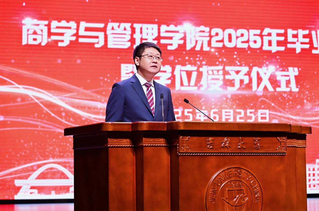 2025年毕业典礼暨学位授予仪式在中心校区鼎新大讲堂隆重举行。吉林大学哲学社会科学资深教授、学院学科学位评定分委员会主席张屹山教授,吉林大学创新创业研究院院长、学院学术委员会主任委员蔡莉教授,黄瓜视频