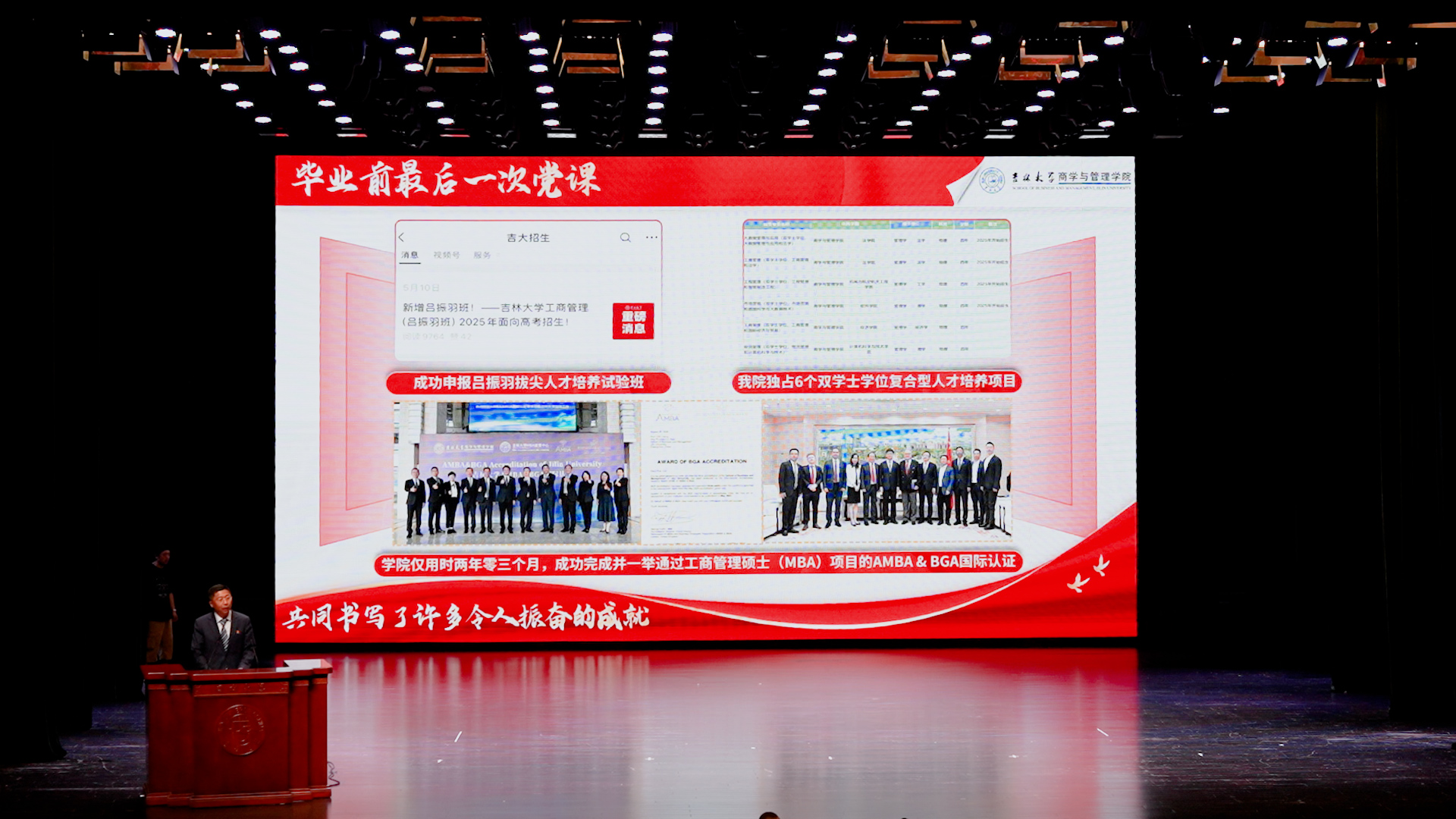 赵军特别提到,这段难忘的求学岁月里,同学们不仅收获了学识,更经历了特殊时期的淬炼。他动情地描绘了疫情期间师生同心抗疫的感人场景—从“千人迁徙”到“云端课堂”,从老师们身兼数职的守护到同学们志愿服务的闪光,这些并肩作战、守望相助的珍贵记忆,共同铸就了充满“商管温度”的青春印记,是同学们未来征途中最宝贵的“神级皮肤”。