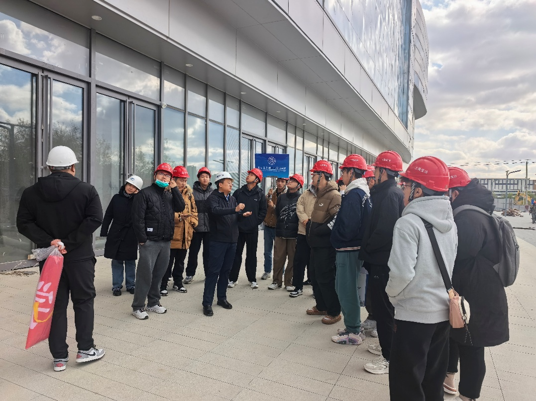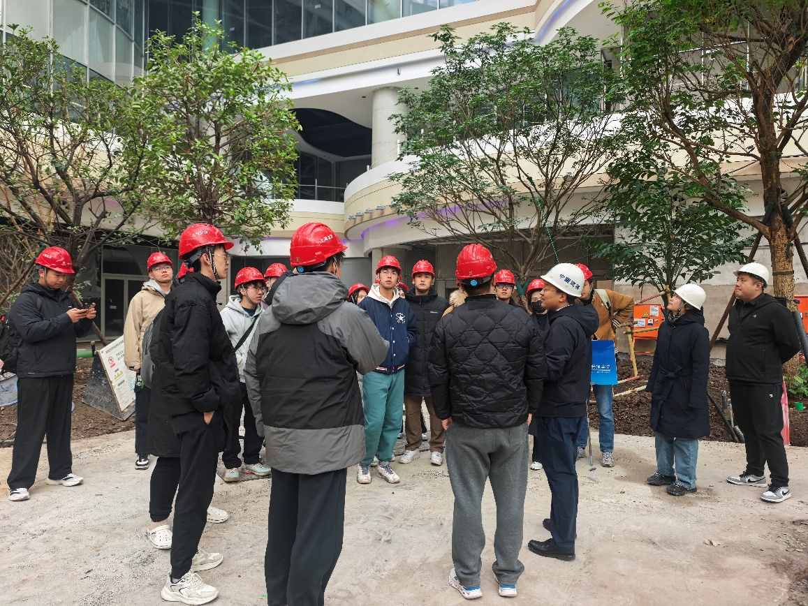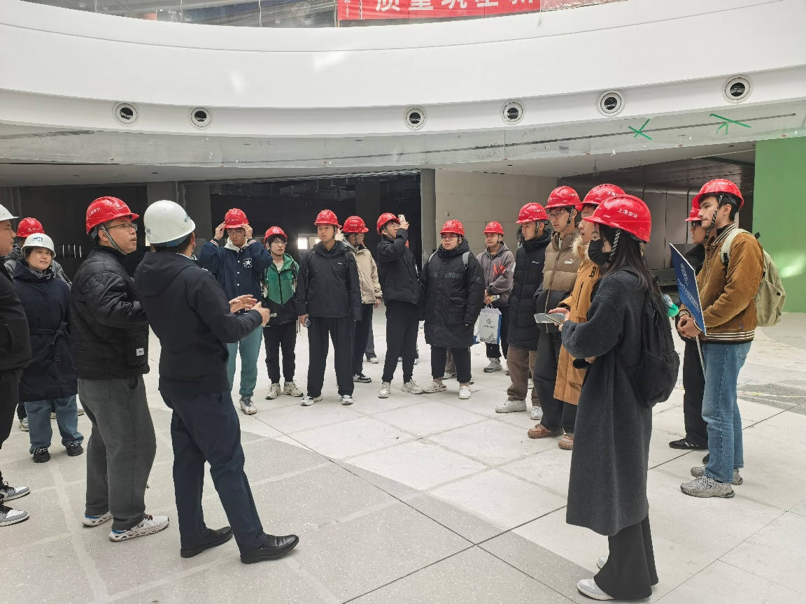 随后,师生走进商业综合体施工现场,围绕“进度—成本—质量—安全(PQCS)”一体化项目管理展开学习。项目团队介绍了综合体多专业交叉的平面组织与垂直交通设计、机电综合管线的BIM碰撞检查与深化排布、幕墙系统的构造层次与防火分隔、地下空间与基坑周边环境协同治理等重点内容。参学同学实地观察了安全文明标准化、智慧工地平台在劳务实名制、塔吊监测与视频巡检方面的应用,并了解绿色施工与双碳导向下的建筑垃圾分类、雨污分流及海绵化改造等举措。项目团队还分享了作为重点工程在审批、验收、协调与公众沟通等方面的特殊要求与经验。