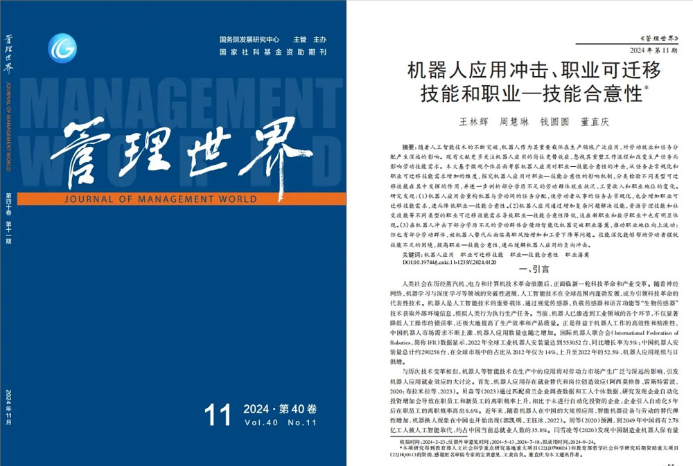 近日,吉林大学数量经济研究中心王林辉教授与华东师范大学经济与管理学院博士生周慧琳、安徽农业大学经济管理学院钱圆圆副教授、浙江财经大学管理学院董直庆教授的合作论文“机器人应用冲击、职业可迁移技能和职业—技能合意性”发表于《管理世界》2024年第11期。