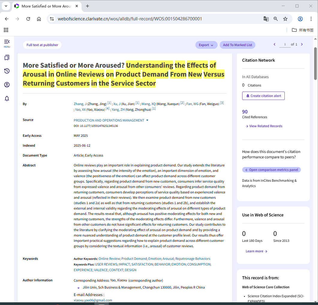 讲师姚晓旭与东北财经大学数据科学与人工智能学院徐健教授、张婧副教授、澳大利亚伊迪斯科文大学王学群教授、美国爱荷华大学樊卫国教授合作撰写的论文“More Satisfied or More Aroused? Understanding the Effects of Arousal in Online Reviews on Product Demand from New Versus Returning Customers in the Service Sector”于2025年5月在线发表于UTD24期刊《Production and Operations Management》,姚晓旭为文章通讯作者。这是我院教师首次在国际顶级管理学期刊UTD24期刊上发表论文,实现了我院“十四五”期间国际顶级期刊论文“零”的突破!