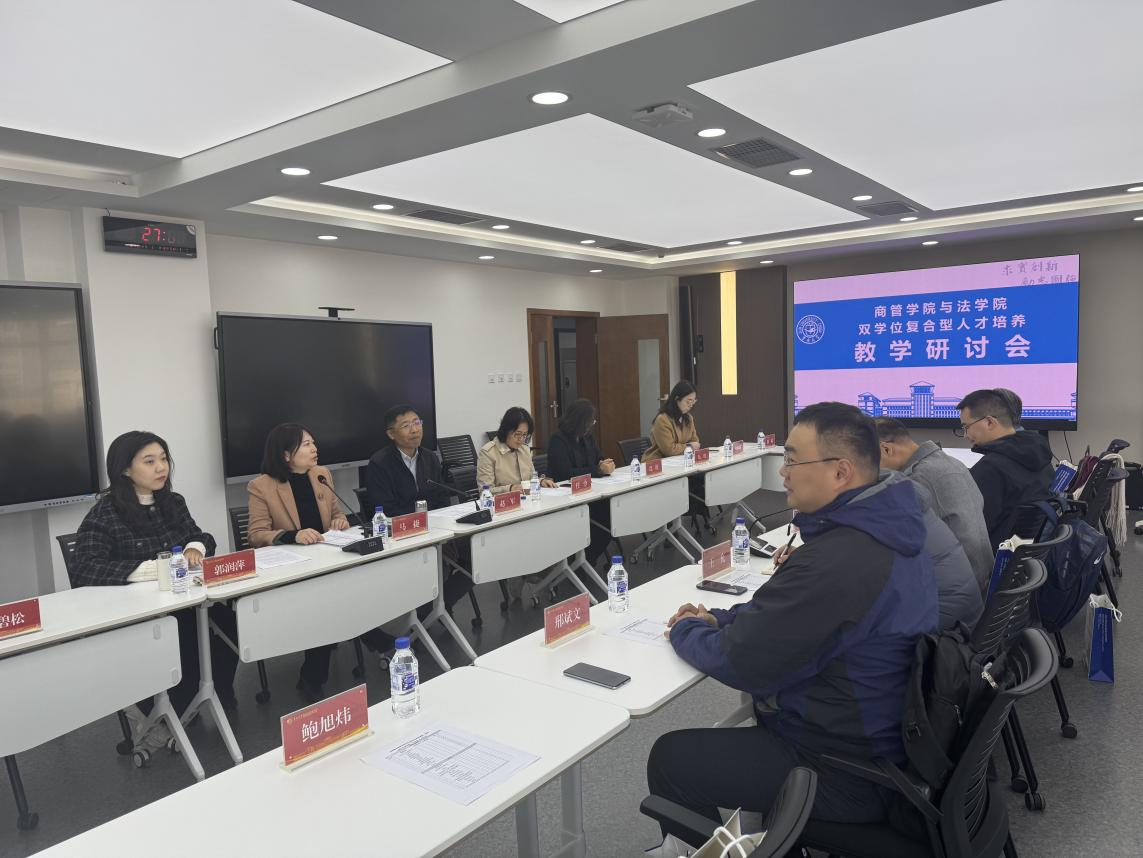 党委书记赵军首先在致辞中回顾了学院整合背景,指出经过三年建设,学院已完成多专业、多方向培养方案的统一整合,为双学位项目推进奠定了坚实基础。他强调,面对经济社会发展对复合型人才的迫切需求,单一学科培养模式已难以适应现实需要,双学位项目是打破学科壁垒、推动人才培养内涵式发展的重要举措,期待与法学院携手打造高质量的跨学科育人体系。法学院教学副院长王充介绍了近年来法学院在复合型人才培养方面的系列布局,对双学位项目的战略意义予以高度肯定,并对拓宽双学位人才就业与升学渠道提出了建设性意见。马捷副院长进一步从商管学科角度出发,从教学管理和教学组织维度介绍了商管学院对双学位项目的支持和保障政策,阐述了大类招生背景下双学位项目的课程整合与教学组织思路。