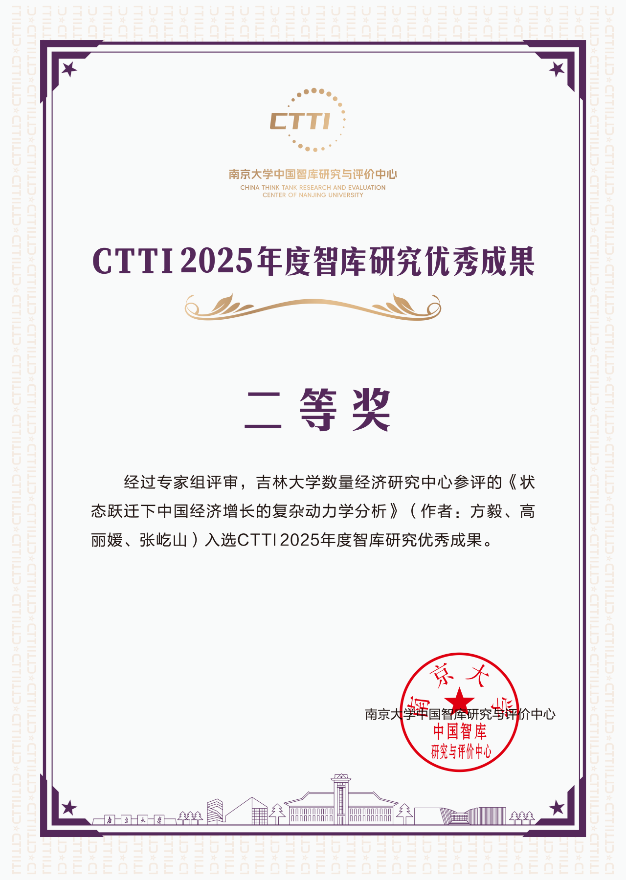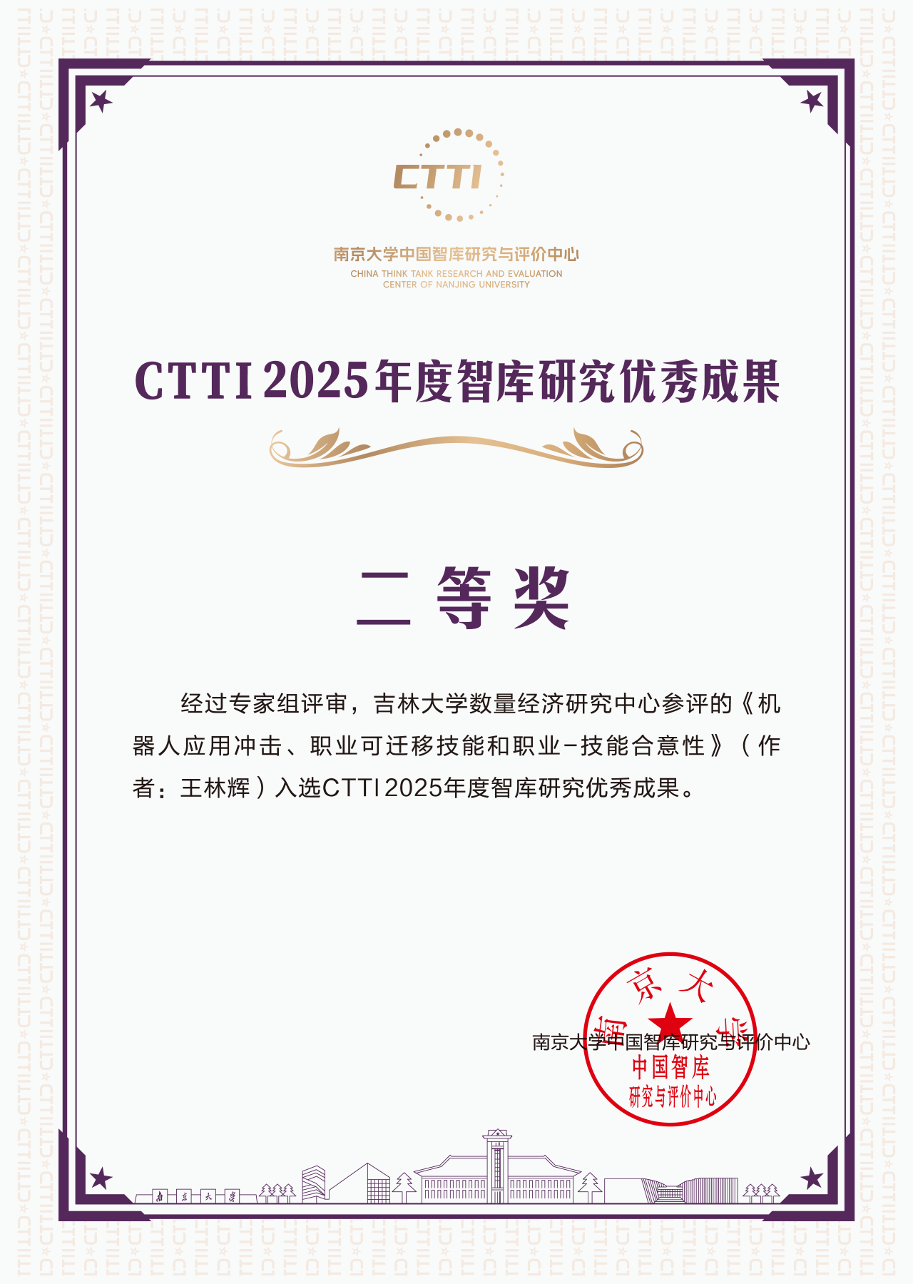 吉林大学数量经济研究中心两项成果《机器人应用冲击、职业可迁移技能和职业-技能合意性》(作者:王林辉)和《状态跃迁下中国经济增长的复杂动力学分析》(作者:方毅、高丽媛、张屹山)获评CTTI2025年度智库研究优秀成果二等奖。